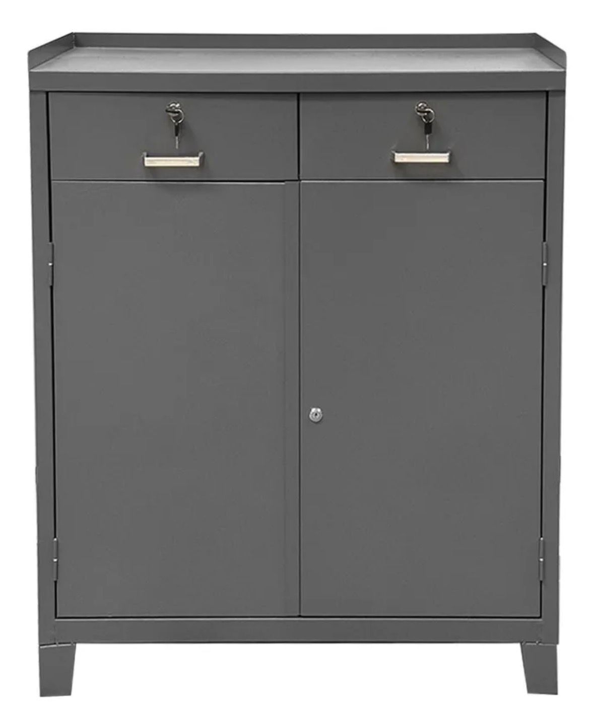 Organize suas ferramentas com segurança e praticidade. Este armário de aço multiuso/ferramenteiro reúne 2 gavetas superiores com chave e compartimento inferior com 2 portas e tranca, além de 1 prateleira interna que divide o vão inferior, mantendo tudo no lugar. Produzido em aço com tratamento fosfatizante e pintura eletrostática a pó, oferece alta resistência ao uso diário, riscos e umidade — ideal para oficinas, áreas de manutenção, almoxarifados, indústrias e garagens. Ficha Técnica: Material: Aço Tratamento: Fosfatizante Acabamento: Pintura eletrostática a pó Fechamentos: Tranca com chave Prateleiras internas: 1 (no compartimento inferior) Dimensões (A × L × P): 100 × 90 × 40 cm Indicado para: Oficinas, manutenção, indústrias, almoxarifados, garagens Cor da foto: Cinza (pode haver leve variação de tonalidade conforme lote/monitor)